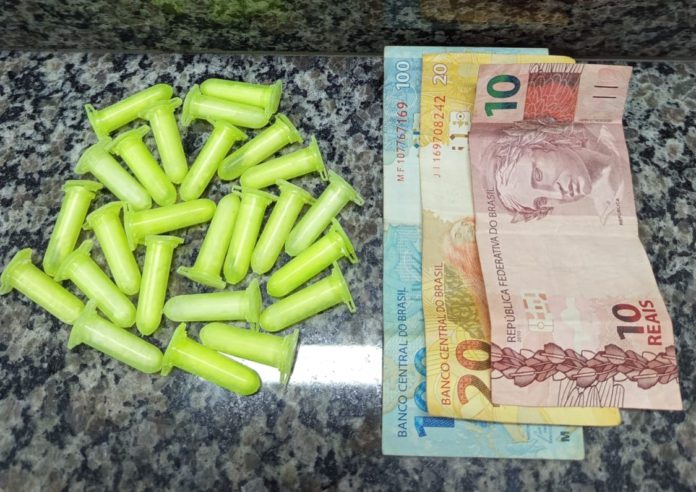 O indiciado permaneceu no local e foi abordado, sendo encontrado com 25 flaconetes de cocaína, totalizando 39 gramas, além de R$ 130 em dinheiro.