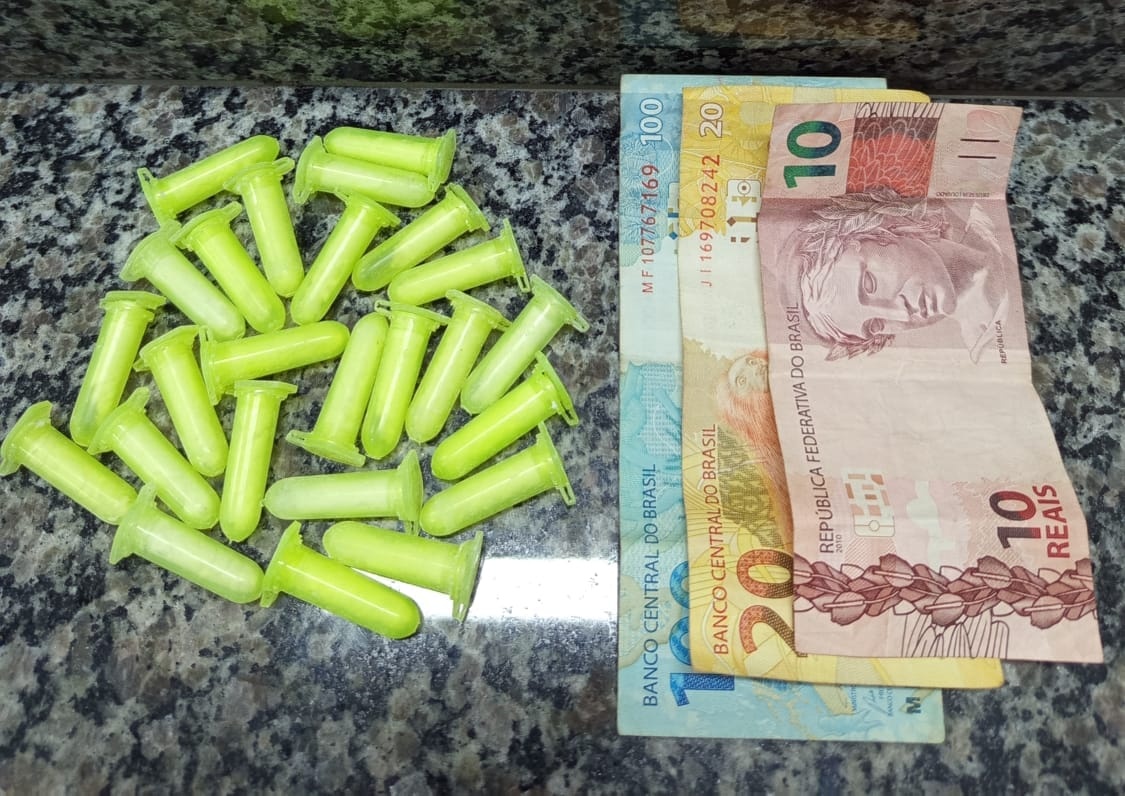 De acordo com a PM, ele foi flagrado entregando algo a um motociclista, que fugiu ao perceber a aproximação da viatura. O indiciado permaneceu no local e foi abordado, sendo encontrado com 25 flaconetes de cocaína, totalizando 39 gramas, além de R$ 130 em dinheiro.