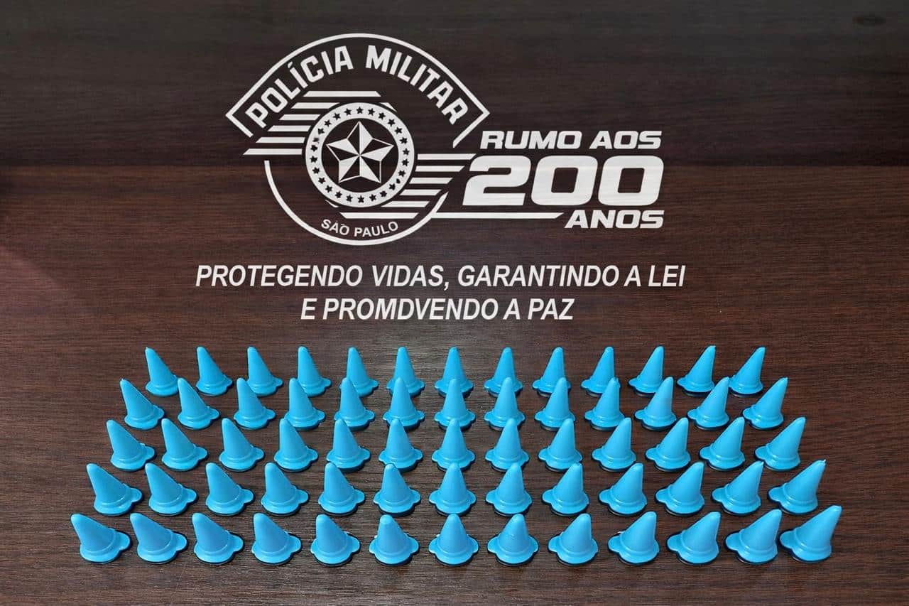Durante o acompanhamento, um dos suspeitos — identificado posteriormente como adolescente — dispensou uma sacola sobre um telhado. O material foi localizado pelos policiais e continha 66 eppendorfs com substância análoga à cocaína.