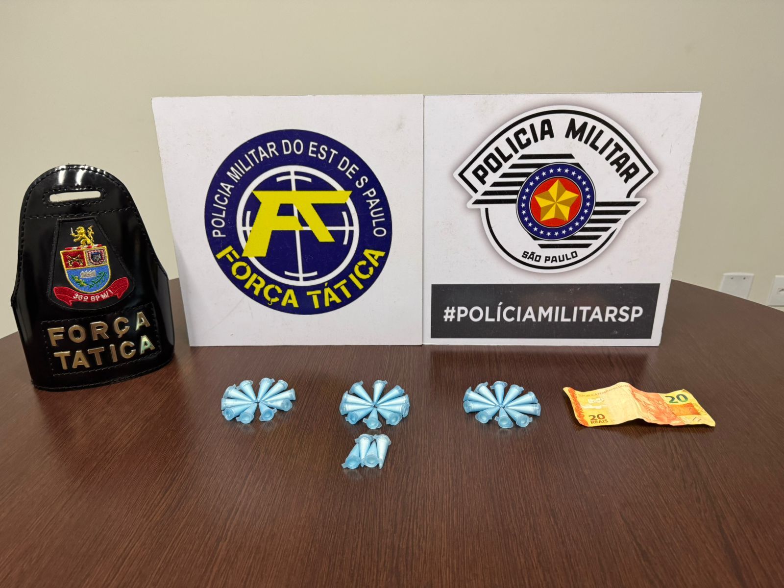 Durante as buscas pelo local, foram encontrados 34 eppendorfs de cocaína, além de R$ 20 em dinheiro.