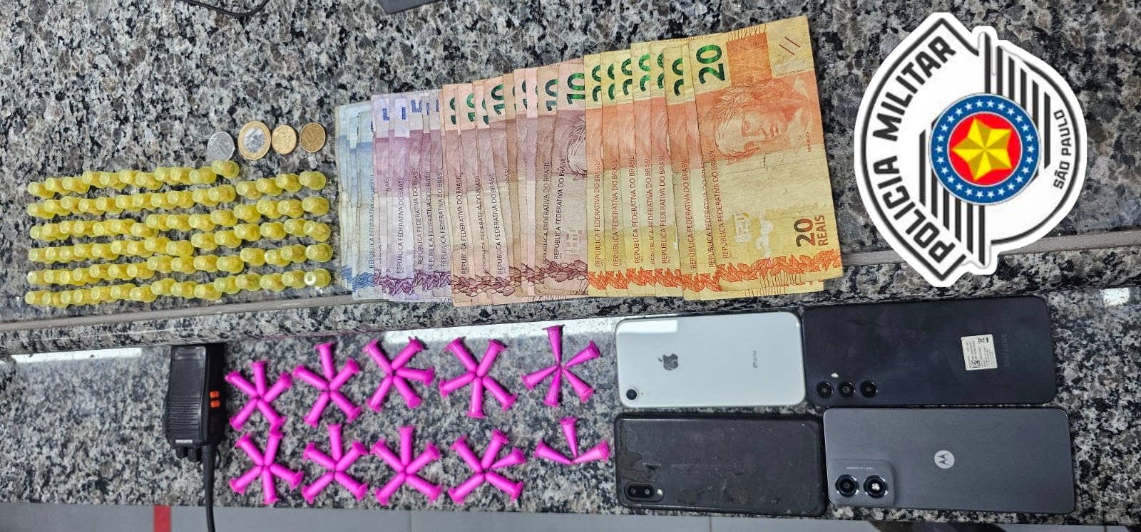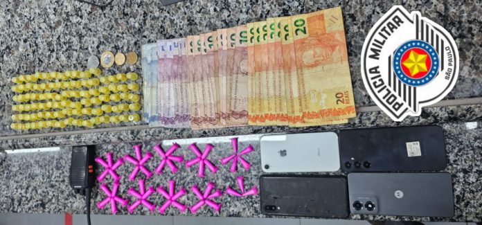Com ele, os policiais encontraram uma pochete contendo 48 eppendorfs de cocaína, 86 pedras de crack, R$ 339,70 em dinheiro, além de três celulares (Samsung, Motorola e iPhone). O jovem confessou que vendia drogas no local.