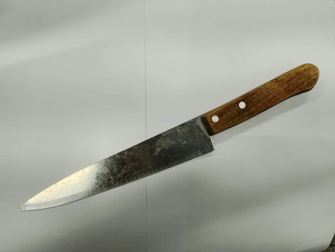 No local, os policiais encontraram uma faca caída próximo ao portão, reconhecida pelas vítimas como sendo do autor.