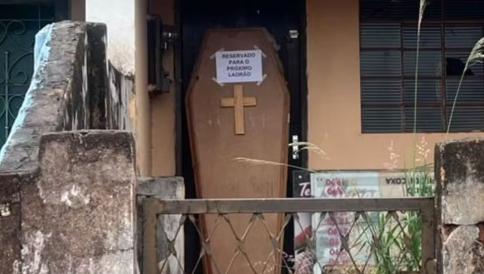 Cansado de assaltos, morador coloca caixão com recado na porta de casa