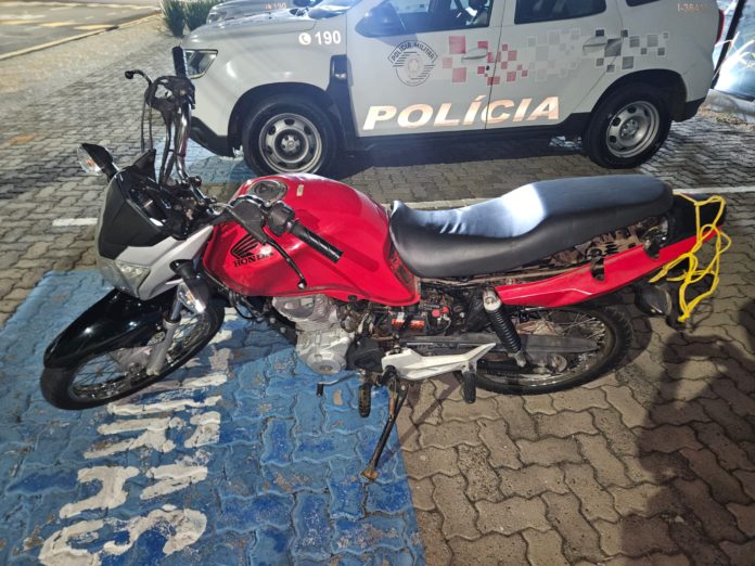 Uma motocicleta foi apreendida pela Polícia Militar na madrugada desta segunda-feira (30), no Jardim dos Ipês, em Leme (SP), após o condutor fugir de uma abordagem.