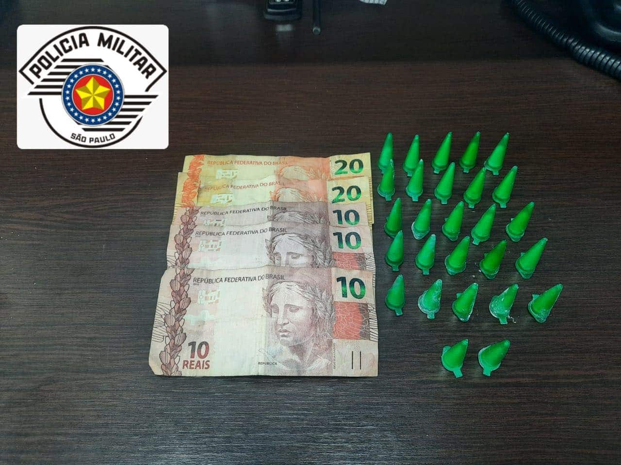 Na abordagem, foram encontrados com Kauan R$40 e cinco flaconetes de cocaína. Em uma busca nas proximidades, os policiais localizaram mais 20 flaconetes da mesma droga escondidos sob uma moita, totalizando 27 porções de cocaína (27 gramas).