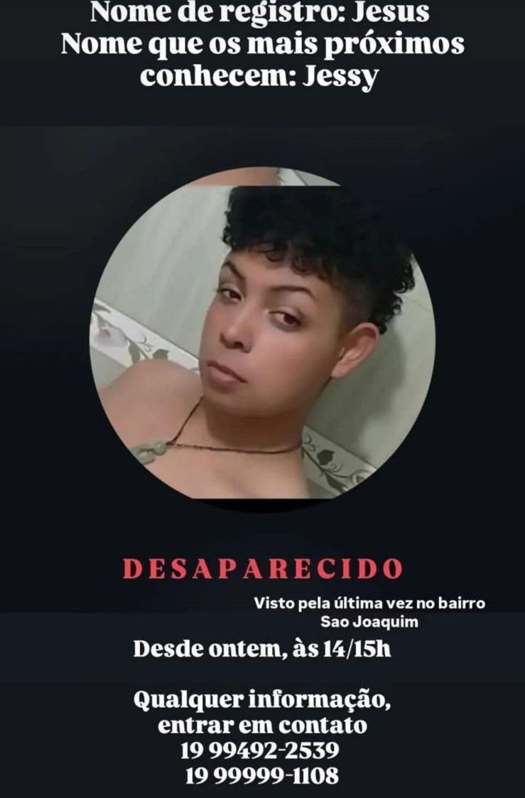 Quem tiver qualquer informação que possa contribuir com as buscas pode entrar em contato com a irmã, Patrícia Vicente, pelo telefone: (19) 99852-9214.