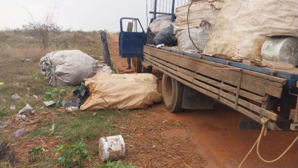 No momento da abordagem, dois “big bags” contendo resíduos sólidos (plásticos e outros materiais) já estavam sendo despejados em área pública, e outros cinco ainda estavam na carroceria, prontos para serem descartados.