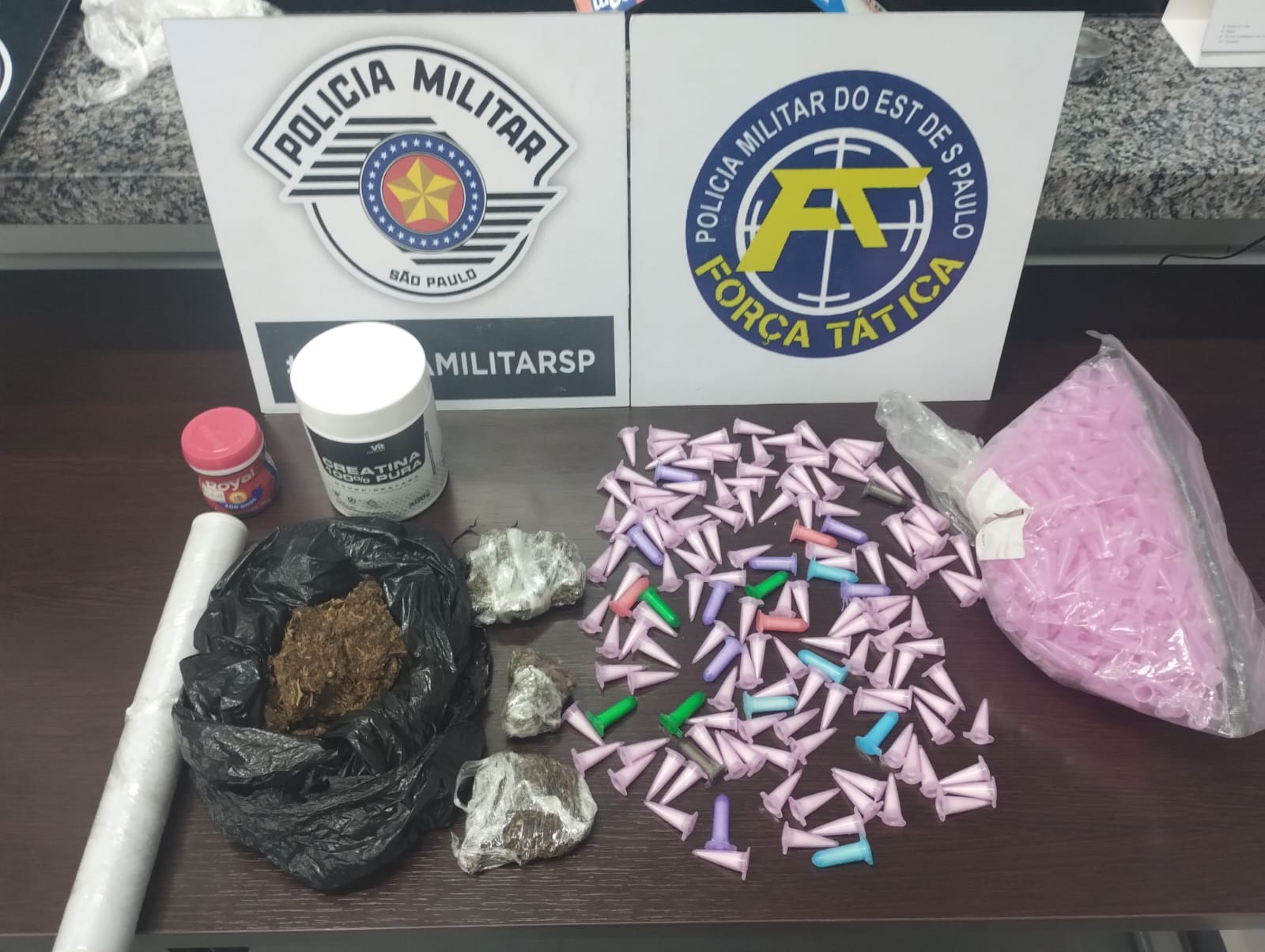 Ao todo, foram apreendidos 151 eppendorfs contendo substância análoga à cocaína (aproximadamente 174 gramas), quatro porções de substância análoga à maconha (cerca de 186 gramas), além de 500 eppendorfs vazios, um rolo de plástico filme, um pote de fermento em pó e um pote de creatina, itens comumente utilizados para embalo e mistura dos entorpecentes.