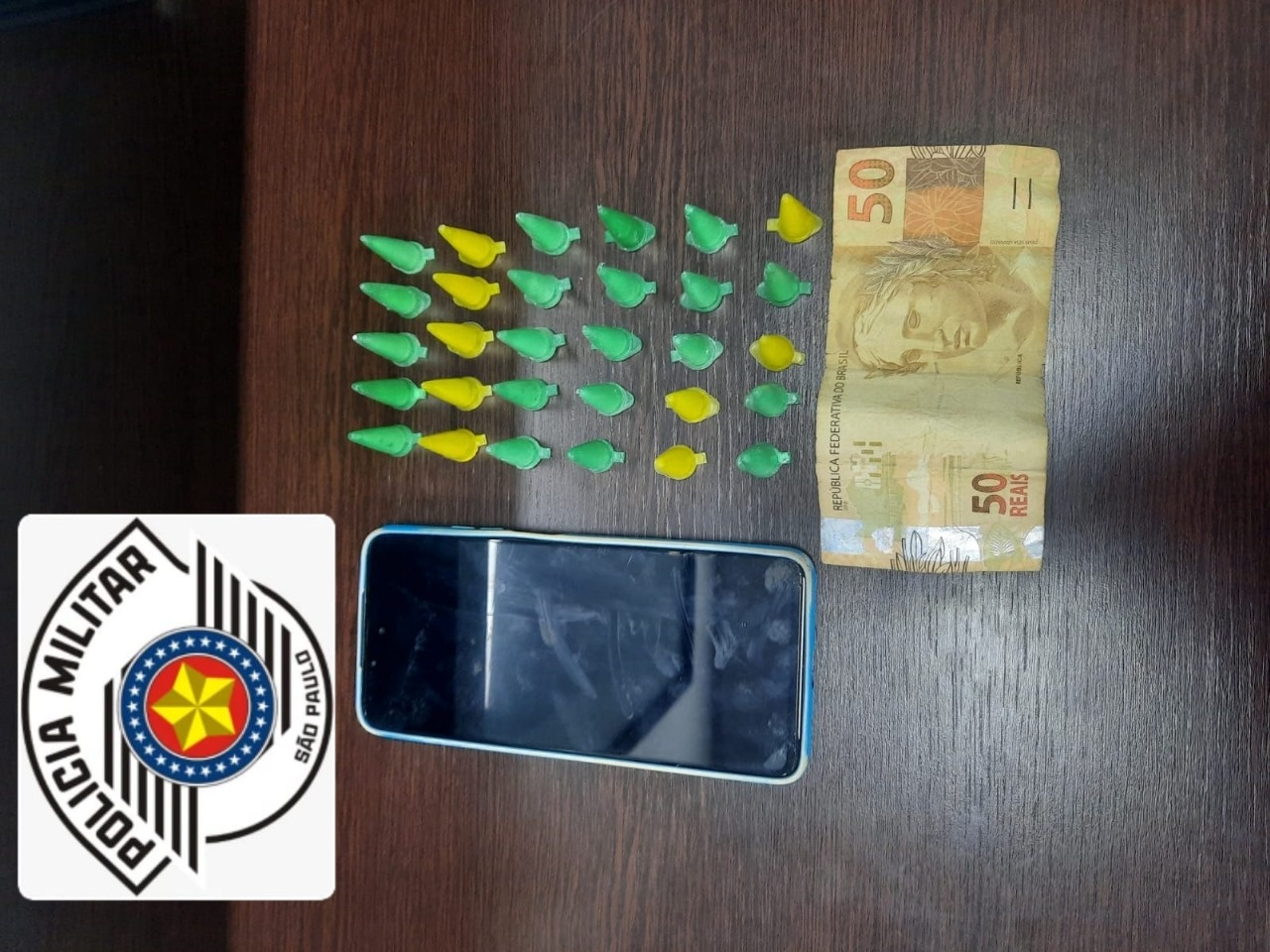 Com base nas características repassadas, a equipe encontrou o suspeito, que tentou esconder algo ao perceber a viatura. Na abordagem, foram apreendidos R$ 50 em dinheiro e oito flaconetes de cocaína. Em buscas nas proximidades, os policiais localizaram outros 22 flaconetes escondidos em uma moita, totalizando 30 porções da droga.