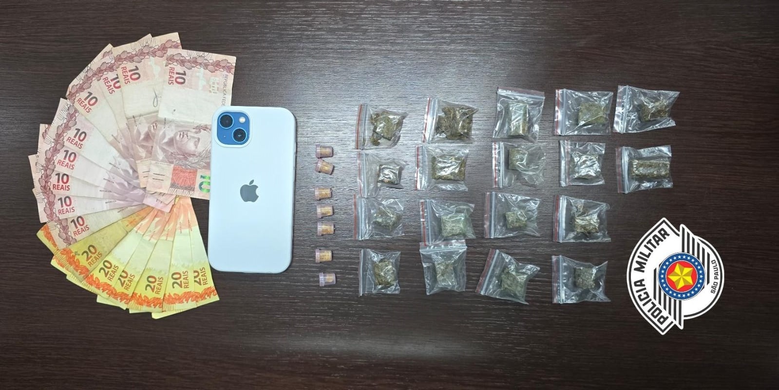 Ao perceberem a presença da equipe, os suspeitos correram em direção a uma área de mata. Um deles foi alcançado e, durante a revista, os policiais encontraram uma bolsa com 18 porções de maconha, 7 pedras de crack e R$ 210 em dinheiro.