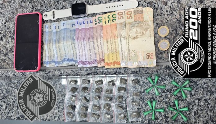 Com ele, os PMs encontraram 20 eppendorfs de cocaína (23g), 29 buchas de maconha (67g), um celular Samsung e R$ 231 em dinheiro.