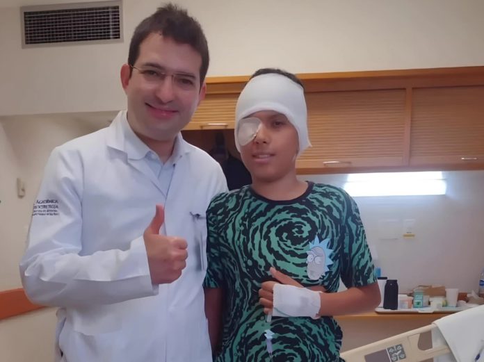 “A todos, hoje o Miguel teve alta hospitalar, mas os cuidados e a reabilitação continuam em casa. Primeira etapa vencida e, se Deus permitir, seus olhos também serão curados. Nosso grandioso agradecimento.”