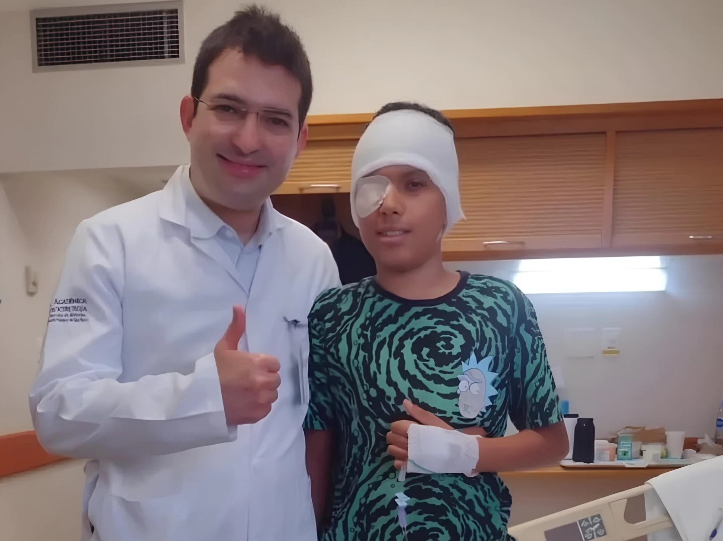 A foto que acompanha a publicação mostra Miguel Scherma Perusse ao lado do médico responsável pelo procedimento, Dr. Marcos Devanir. A família segue confiante na recuperação total do menino e agradece o carinho e as orações de todos.