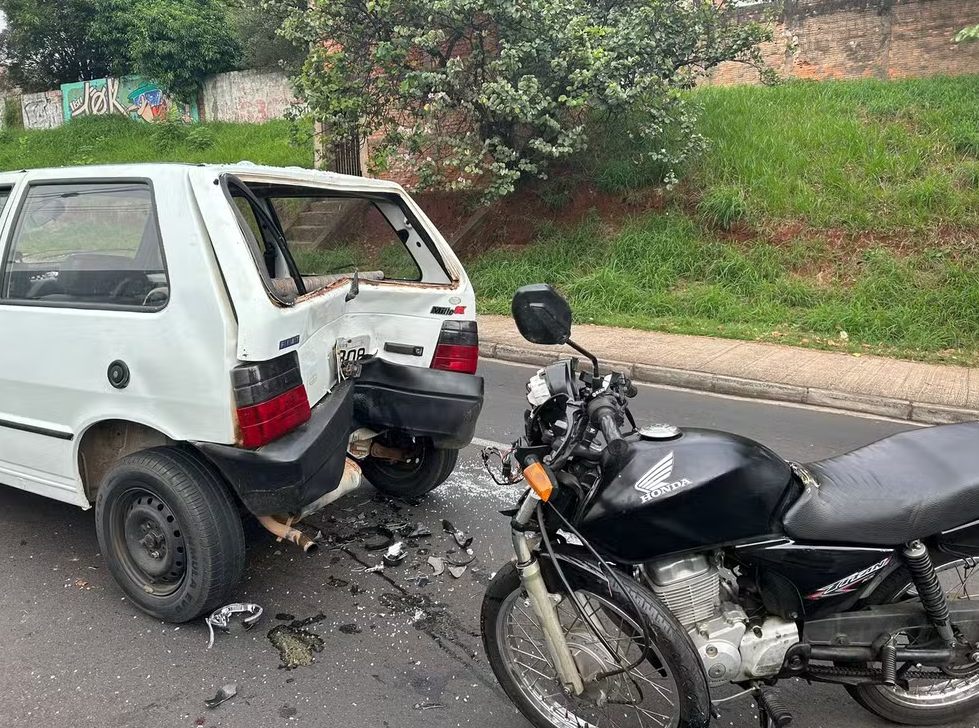 Um motociclista ficou gravemente ferido ao bater contra a traseira de um carro, em São Carlos (SP), na manhã desta quinta-feira (9). Com a força da colisão, a vítima quebrou o vidro do carro Fiat Uno e foi arremessado para dentro do veículo, sofrendo um corte grave na região do pescoço.