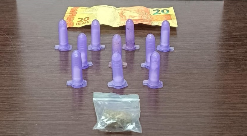 Durante a revista, foram encontrados em posse da mulher: 10 flaconetes de cocaína, 1 porção de maconha e R$ 20,00 em dinheiro.