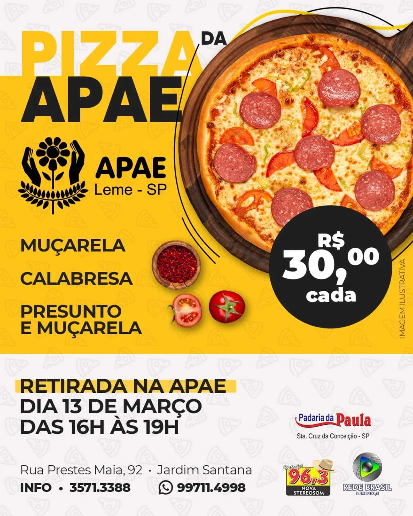 A APAE de Leme (SP) realiza mais uma ação solidária com o objetivo de arrecadar recursos para a manutenção de seus serviços. Trata-se da “Pizza da APAE”, que oferece pizzas a R$ 30,00 cada, em três sabores: muçarela, calabresa e presunto com muçarela.