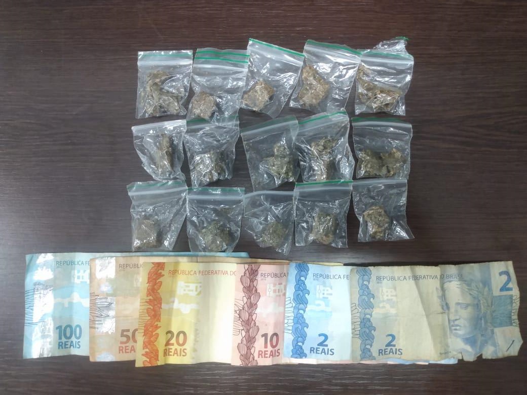 Na ação, os policiais localizaram com o adolescente a quantia de R$ 180,00 em notas variadas e, durante a varredura no local, encontraram 15 buchas de maconha.