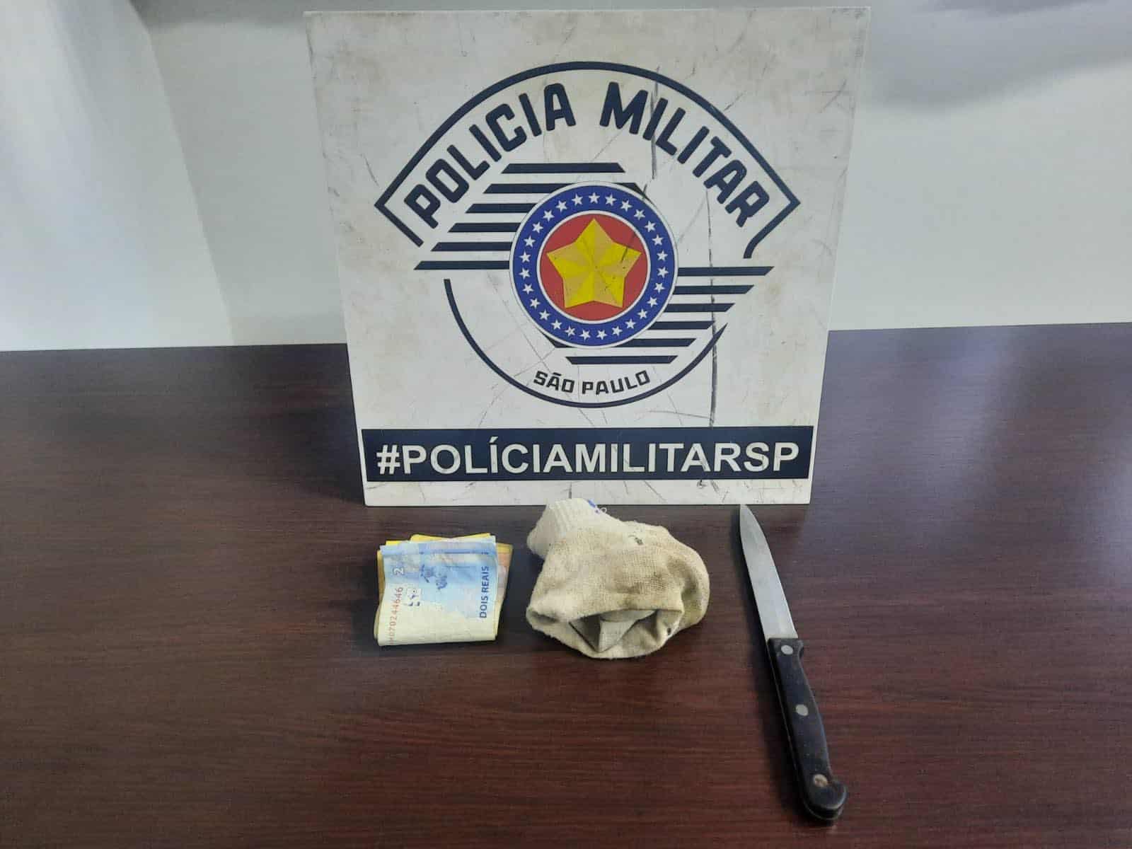 Durante a abordagem, a suspeita apresentou espontaneamente uma faca de 12 cm, a quantia de R$ 86,00 em espécie e uma meia contendo drogas. A averiguação constatou tratar-se de 4 flaconetes de cocaína (4g) e 20 pedras de crack (10g). Com a segunda mulher, nada de ilícito foi encontrado.
