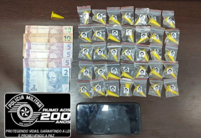 Segundo a PM, ao notar a chegada da viatura, o suspeito — identificado como Leandro, de 30 anos — tentou fugir e jogou um invólucro no chão. Ele foi detido e, durante a revista, os policiais encontraram R$ 37 em dinheiro e um celular Motorola.